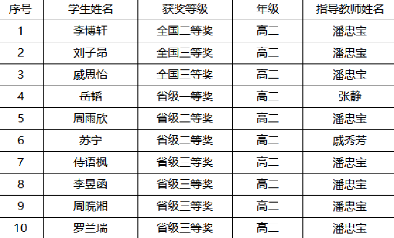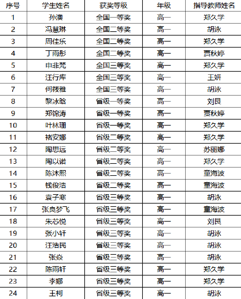 其中,高一年級孫澳同學獲得全國一等獎;高一年級馮慧琳、周佳樂、丁雨彤及高二年級李博軒等4位同學獲得全國二等獎;高一年級申非梵、汪行庫、何筱雅及高二年級劉子昂、戚思怡等5位同學獲得全國三等獎。另有24位同學獲得省級一等獎、二等獎、三等獎。