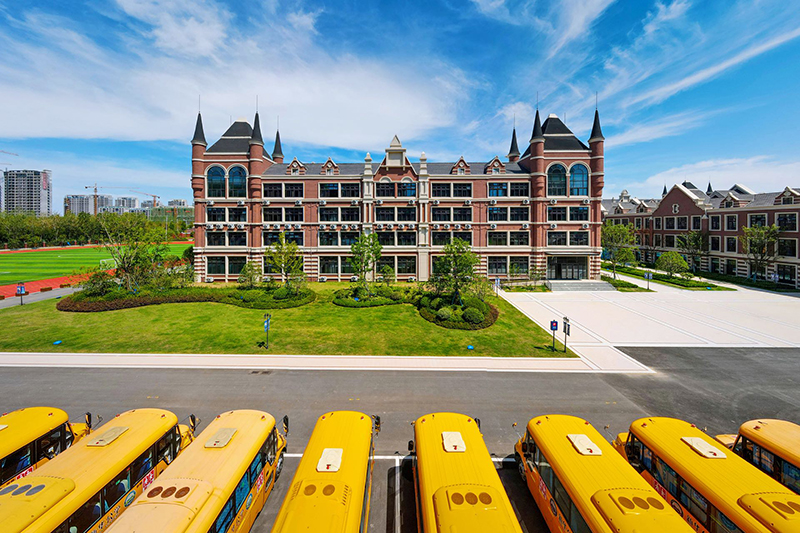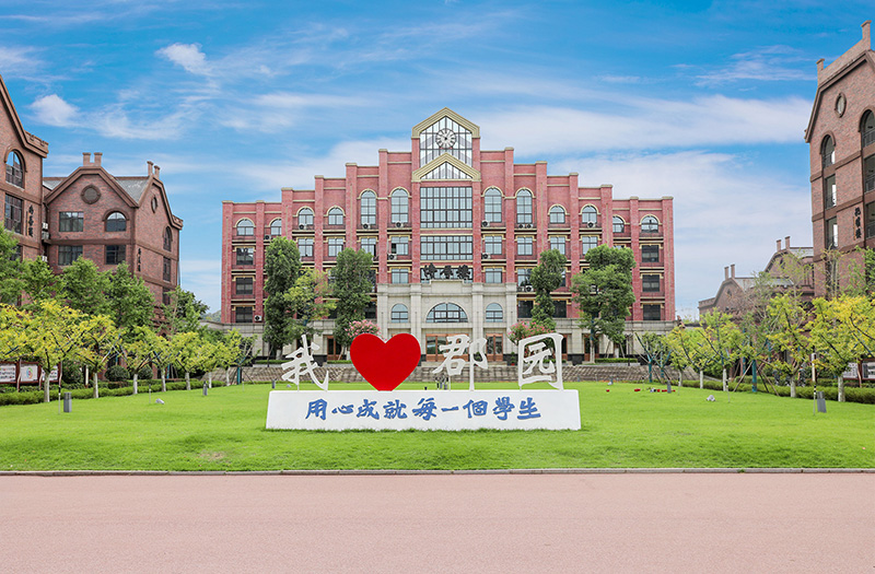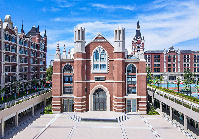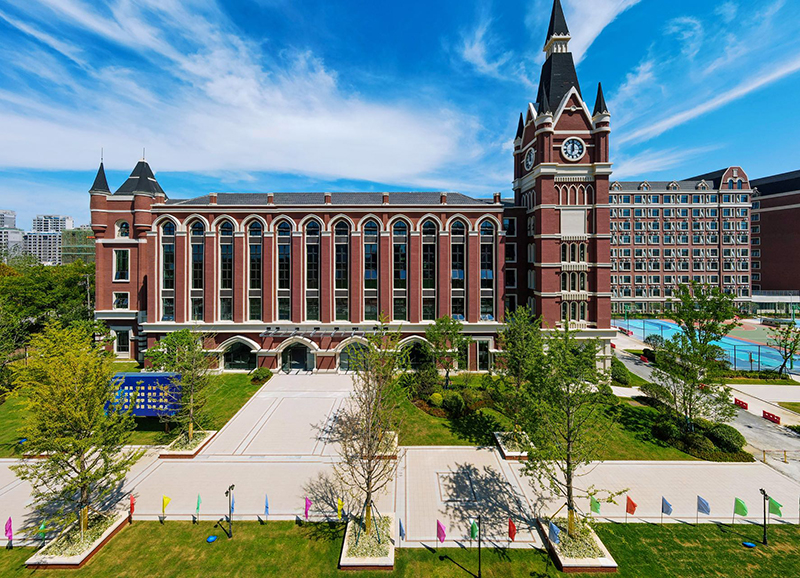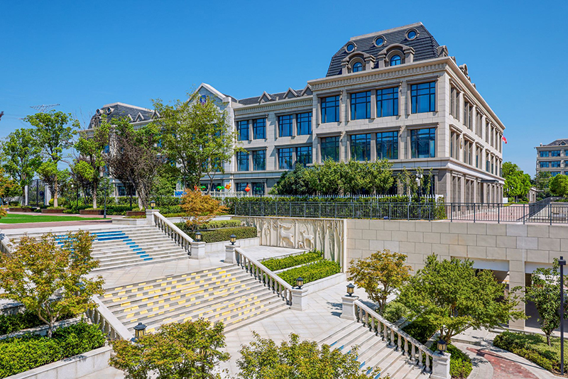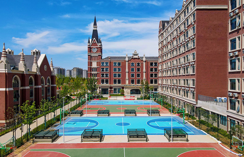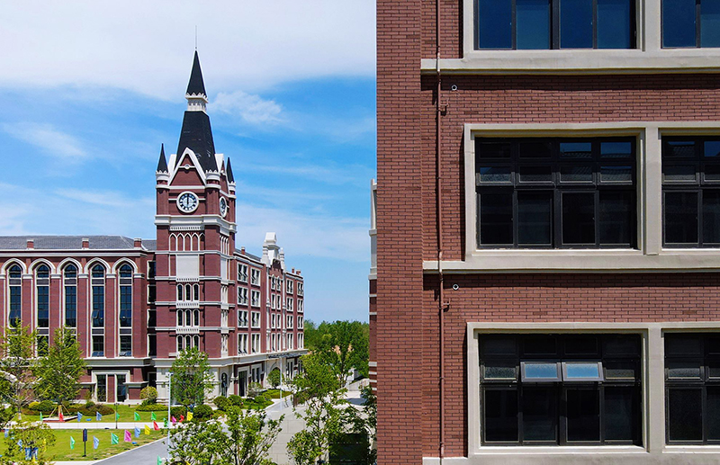 國際藍及華夏紅的配色,突顯出校園國際品質感,褐色的墻面搭配綠茵草地,書香氣息渾然天成。