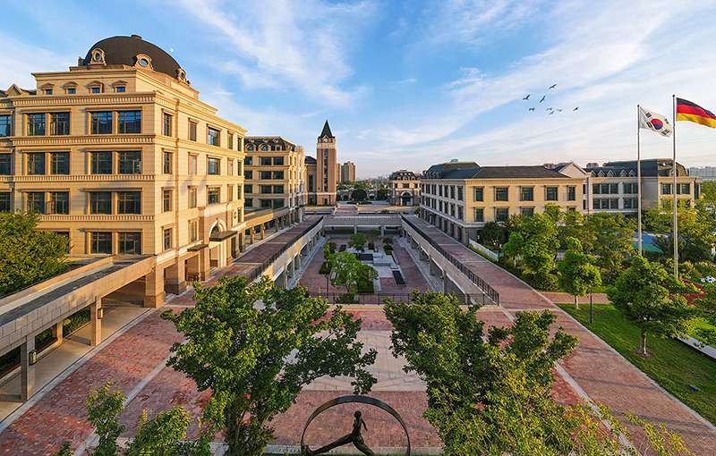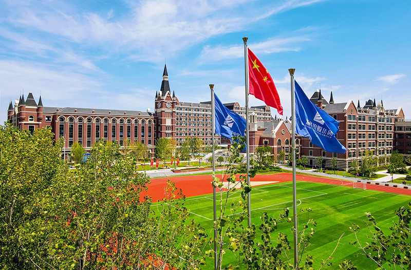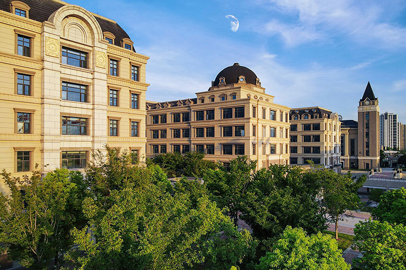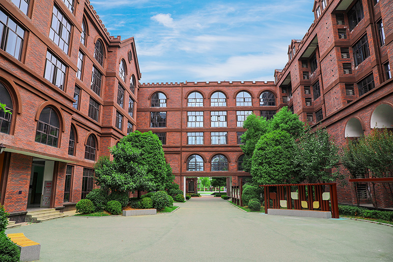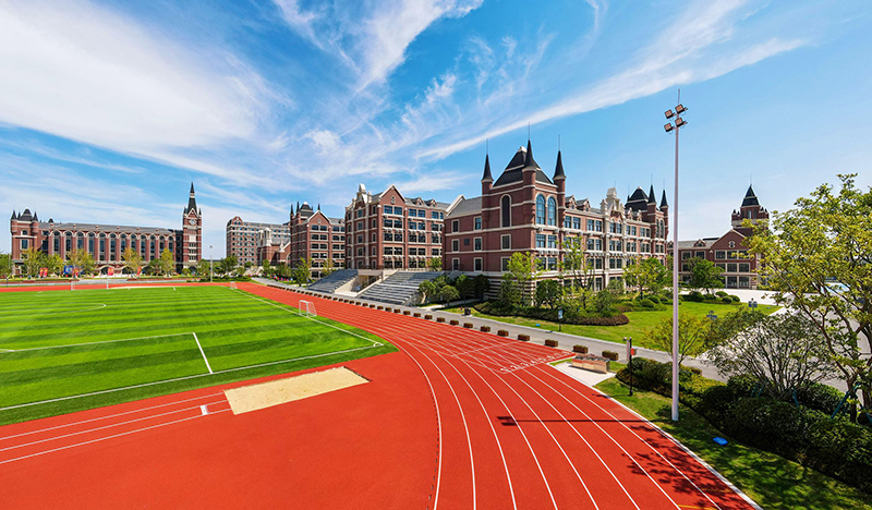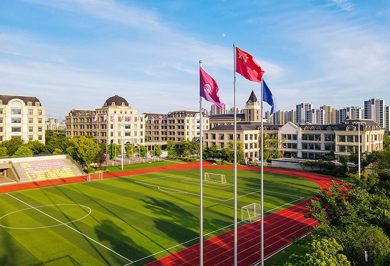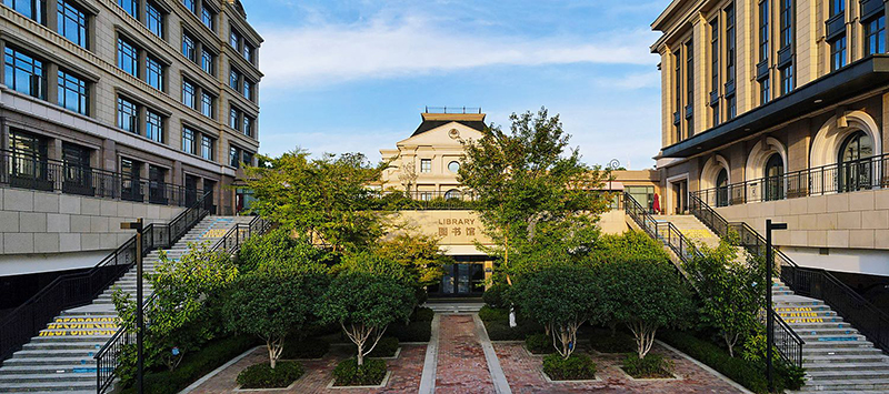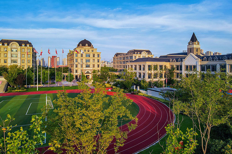 國際藍及華夏紅的配色,突顯出校園國際品質感,褐色的墻面搭配綠茵草地,書香氣息渾然天成。