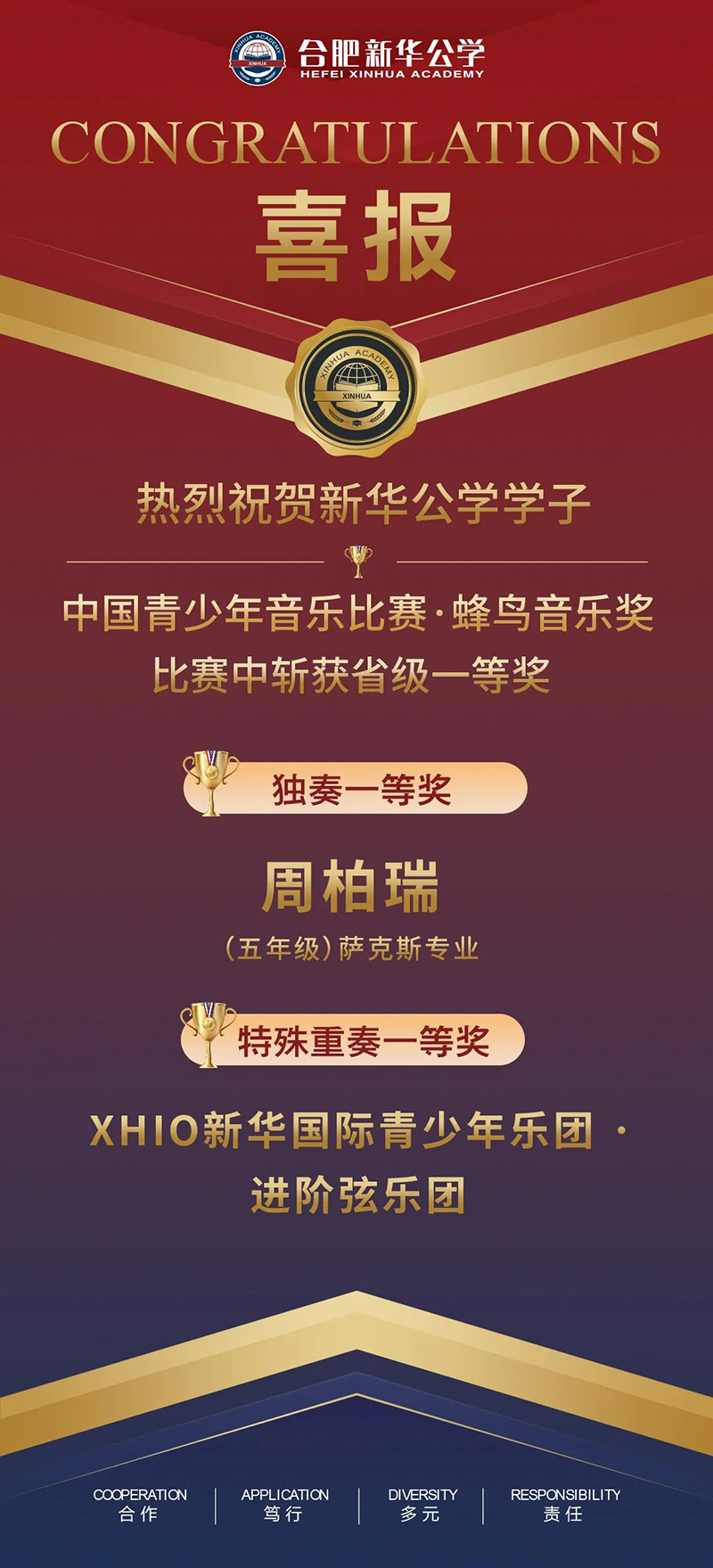 中國青少年音樂比賽·蜂鳥音樂獎(以下簡稱CYMC)是針對中國青少年音樂教育領域首創的全科目推廣室內樂為主的音樂教育項目,比賽科目3年循環一次,每年每個器樂科目均可參賽,但演奏形式不同,以科學的賽制陪伴青少年音樂成長,引導學生從獨奏到與他人合作,并參與到不同的室內樂演奏中,學會聆聽他人,更好理解音樂,享受音樂,提高音樂素養。