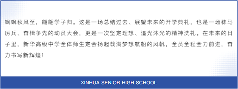 萬(wàn)物積勢(shì)迎秋風(fēng),策馬揚(yáng)鞭續(xù)輝煌。2024年9月10日上午,新華高級(jí)中學(xué)在校運(yùn)動(dòng)場(chǎng)隆重舉行2024年秋季開(kāi)學(xué)典禮暨教師節(jié)表彰活動(dòng)。新華高級(jí)中學(xué)校長(zhǎng)徐邦民,副校長(zhǎng)陳俊、王昌武、蔡賢滿、吳東、方明生等領(lǐng)導(dǎo)及全體師生齊聚一堂,共同見(jiàn)證了這一激動(dòng)人心的時(shí)刻。新學(xué)期,新面貌,我們重新啟程!