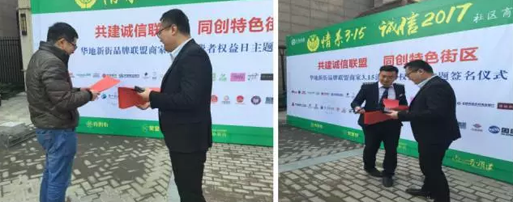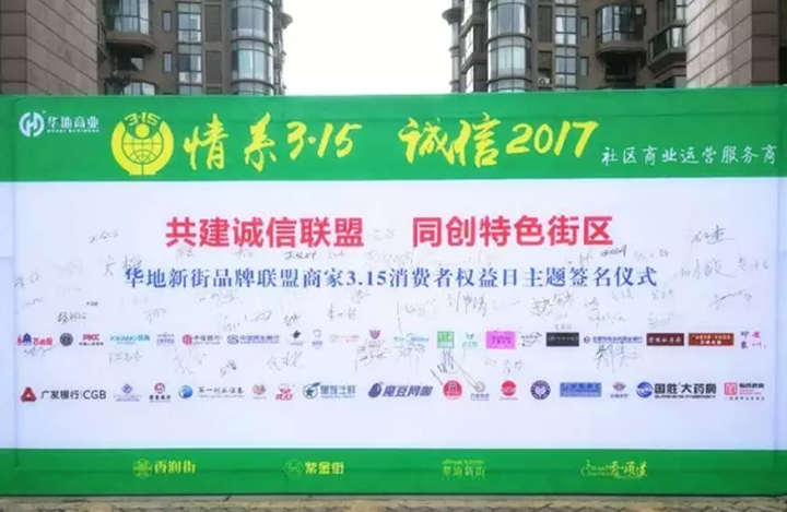 2017年3月15日,“華地新街品牌聯(lián)盟商家3·15消費者權(quán)益日”主題簽名儀式在華地新街隆重舉行。上午10時,各商戶代表齊聚在品牌墻下,由商業(yè)公司工作人員向大家宣讀并發(fā)放《倡議書》,各商戶代表在品牌墻上鄭重簽名,為共建誠信聯(lián)盟,共創(chuàng)特色街區(qū)而簽下鄭重的承諾。